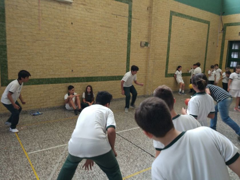 En el centro 7° grado jugando, al fondo 5° jugando. ¿Quiénes juegan? Los chicos y chicas pero también los profes. Esperamos nuestro turno, nos reímos, nos enojamos, nos encontramos y conocemos. Jugando.